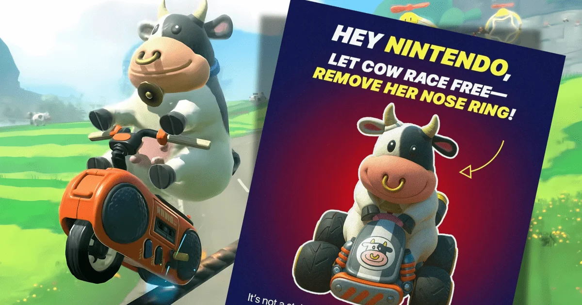 O grupo de campanhas de direitos dos animais Peta está pedindo à Nintendo para remover o anel de nariz da vaca do Mario Kart World.