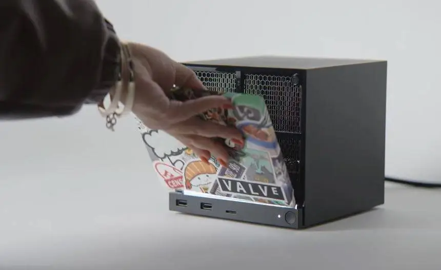 O abismo entre o design imponente e exigente de um PS5 ou Xbox e o frívolo cubo da Steam Machine pode ser intencional. O design chama a atenção, sim. Mas preste atenção à marca que envolve isso. No site oficial, um dos primeiros recursos visuais importantes é um pequeno vídeo de dois aparentes indivíduos LGBTQ+. Role mais para baixo e você verá um vídeo em loop de uma streamer feminina de camisa rosa jogando Vale das Estrelas. Os painéis frontais são exibidos por alguém usando joias e esmaltes.
